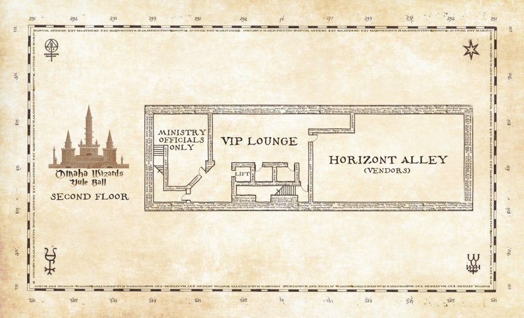Event maps will be available at the Yule Ball. General Admission tickets include a copy printed on plain paper; VIP Ticket holders receive a copy printed on thick parchment-style paper. All event maps are double-sided, produced using oversized 11″ x 14″ paper.